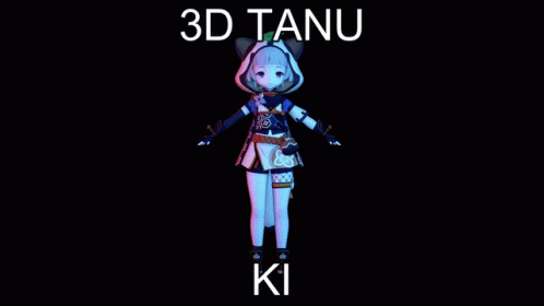 A high-quality 3D animation of the character Sayu Tanuki rotating against a dark background.