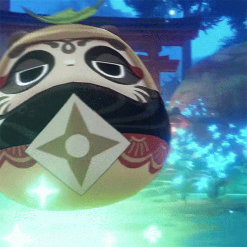 Sayu from Genshin Impact performs a cute animated pose, transforming from a daruma doll.