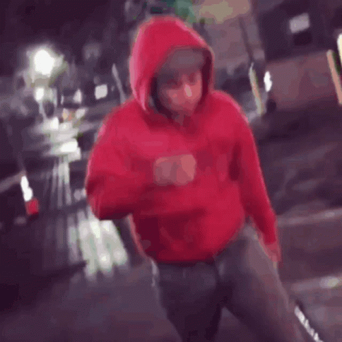 Sazzybarb walks and talks on a dark street at O Block, wearing a red hoodie and surrounded by traffic cones.