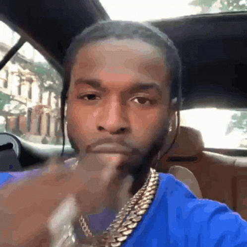 Pop Smoke, accompanied by Sazzybarb, sits in a car, wearing a blue shirt and gold chains, with his hand on his chin.