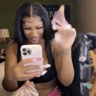 Sazzybarb Queen Opp and Chelle react animatedly while holding a phone and making a peace sign.