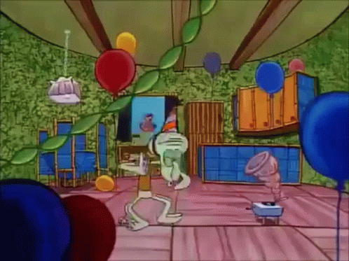 Squidward from Spongebob Squarepants dancing happily in a room decorated with colorful balloons and streamers.
