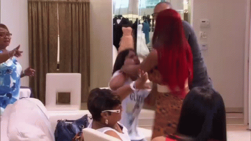 Sazzybarb is involved in a heated altercation with a group of women and a man, shouting 'You Somebody Mama'.