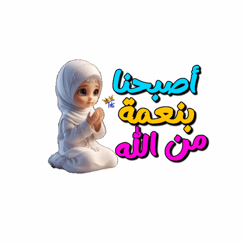 A cute cartoon girl in a hijab praying, with the Arabic phrase "We have woken up by the grace of God" for a good morning.