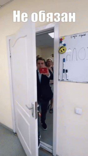 A man holds a red card with a Russian emblem, embodying the popular 'Не обязан' meme, as another man walks out of a room.