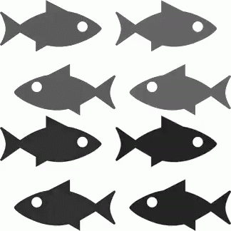 A simple black and white drawing featuring two stylized fish with circular eyes, presented on a plain background.