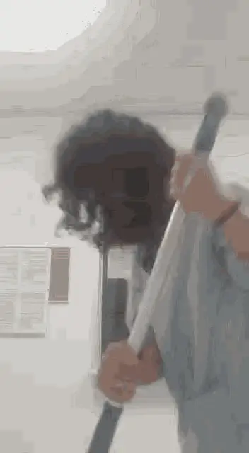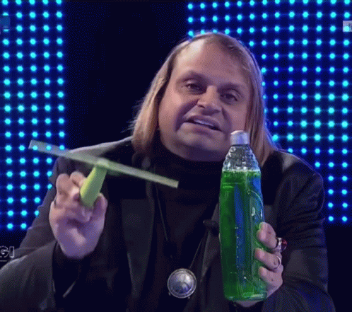 Maurizio Scandurra, with long blonde hair, holds a green bottle and a squeegee, demonstrating cleaning products.