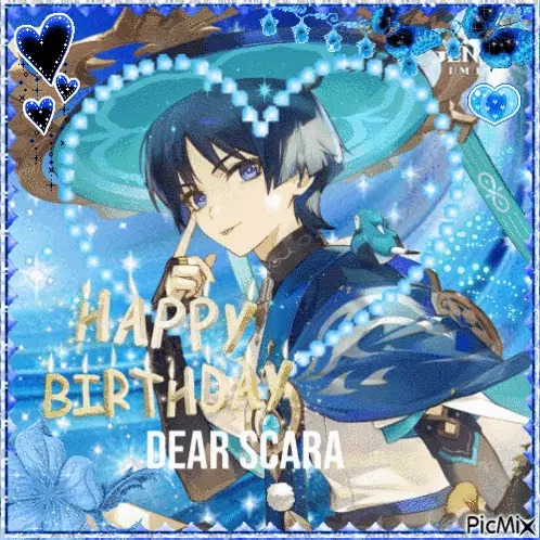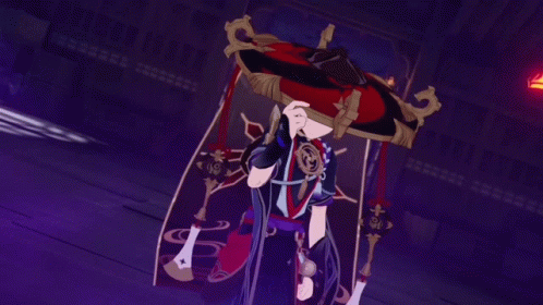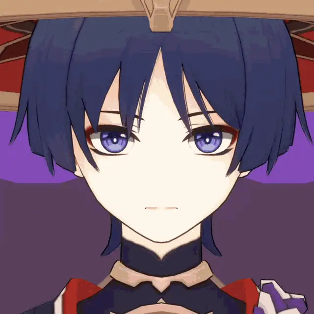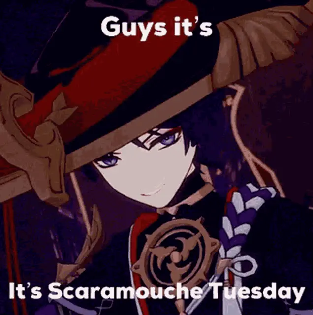 Scaramouche from Genshin Impact, featuring his distinctive red and black hat in a dramatic pose.