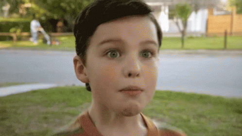 Young Sheldon's eyes widen and mouth drops open in a hilarious scared reaction while standing outdoors.