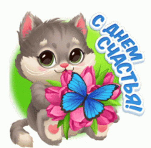 A cute animated kitten holds a bouquet of pink tulips with a blue butterfly, celebrating Happy Happiness Day.