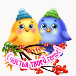 Animated greeting card featuring two cute birds in hats on a berry branch, wishing happiness to your family.