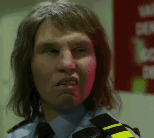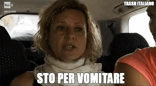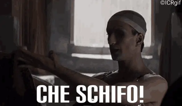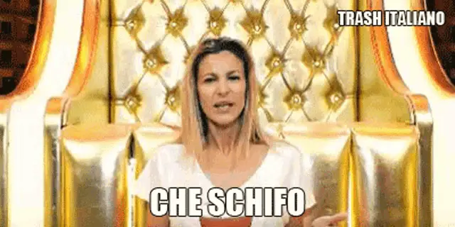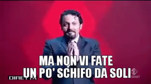 Enrico Brignano, the Italian comedian, passionately asks "Don't you feel a bit disgusted with yourselves?" on a red stage.
