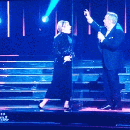 Maite Kelly performs on stage at Schlager Champions, interacting playfully with a male co-host.
