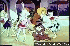 Schleprock and other characters from The Pebbles and Bamm Bamm Show dance at a lively party.