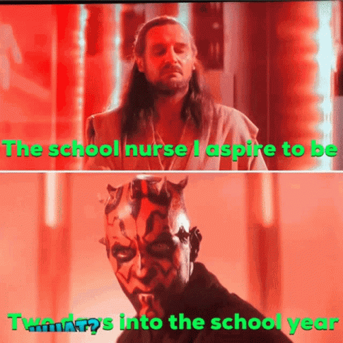 A school nurse's aspirations at the start of the year quickly turn to 'WHAT?' just two days in, meme.
