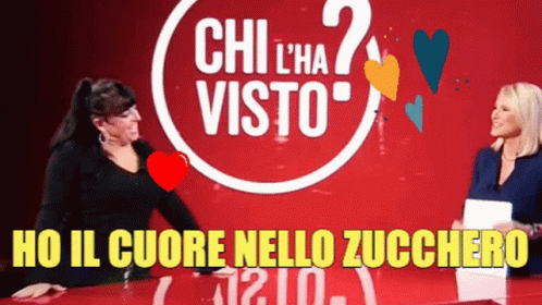Federica Sciarelli and Gigino Wifi on the Italian TV show 'Chi l'ha Visto?', with the phrase 'Ho il cuore nello zucchero'.