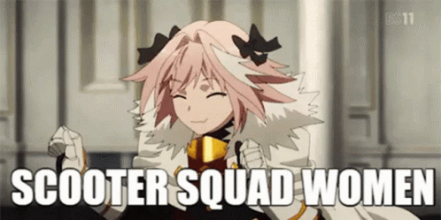 An excited anime character, described as a girl, with pink hair and a fur coat, celebrates with 'Scooter Squad Women' text.