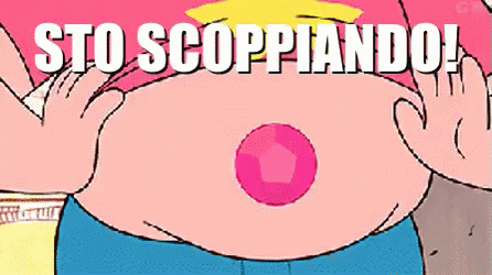 Steven Universe's belly is huge after eating too much, with the caption 'STO SCOPPIANDO!' (I AM BURSTING!).