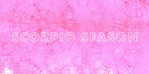 Animated graphic celebrating Scorpio Season with sparkling effects on a pink astrological background.