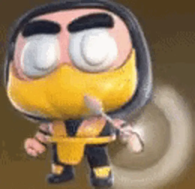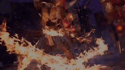 Scorpion from Mortal Kombat engulfed in flames, ready for battle in a dynamic video game scene.