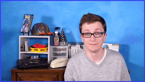 a young man wearing glasses is standing in front of a blue wall with a book titled twist on the shelf