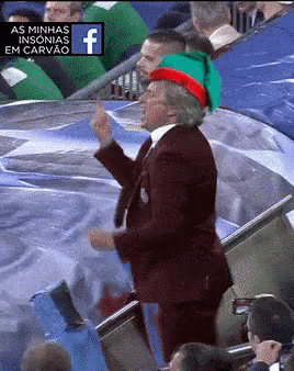 Jorge Jesus, wearing a festive green and red hat, cheers passionately at a Sporting CP football match.
