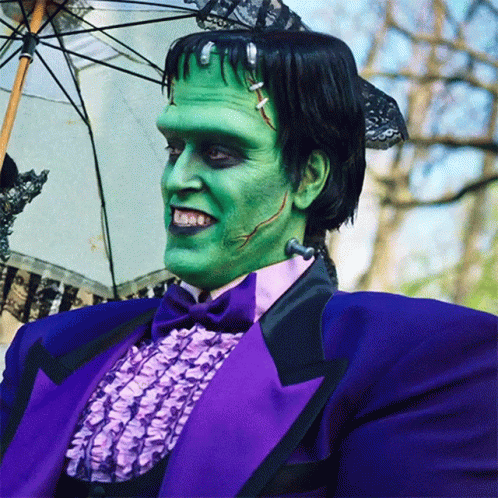 Herman Munster, portrayed by Jeff Daniel Phillips, in his iconic green makeup and purple tuxedo, holding an umbrella.