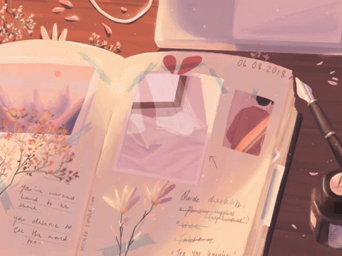 An aesthetic journal open to a page with photos, handwritten notes, and floral decorations, capturing a serene scrapbooking moment.