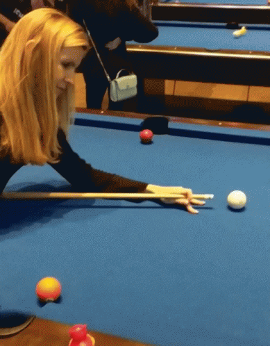 A woman takes a shot during a game of pool, resulting in a scratch or a missed pocket.