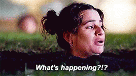 Scream Queens character buried in the ground, looking distressed and exclaiming 'What's happening?!'