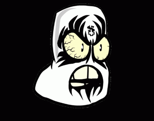A cartoon skull with veiny eyes and a dollar sign on its forehead screams intensely, associated with Sagan.
