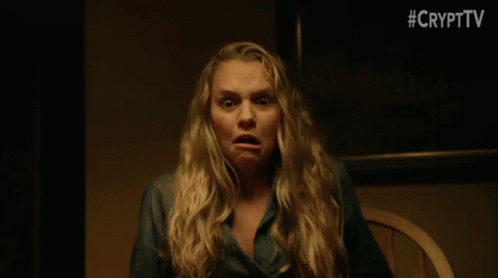 A woman's face contorted in a terrified scream, eyes wide with fear, likely from a horror scene.