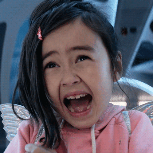 Meiying (Shuya Sophia Cai) makes a hilarious screaming face in a pink hoodie with silver wings.