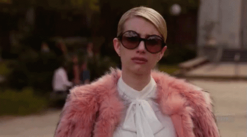 Emma Roberts as Chanel Oberlin from Scream Queens, walking in a pink fur coat and sunglasses.