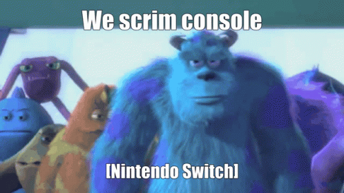 A humorous meme featuring Sulley from Monsters Inc. about scrimming on console, specifically Nintendo Switch.
