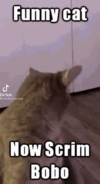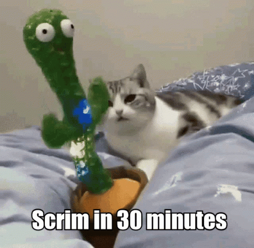 A cat observes a dancing cactus toy with the text 'Scrim in 30 minutes' overlaid, showing a humorous reaction.
