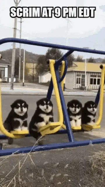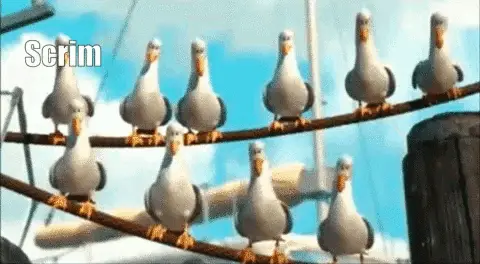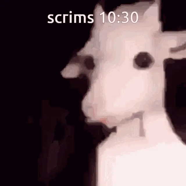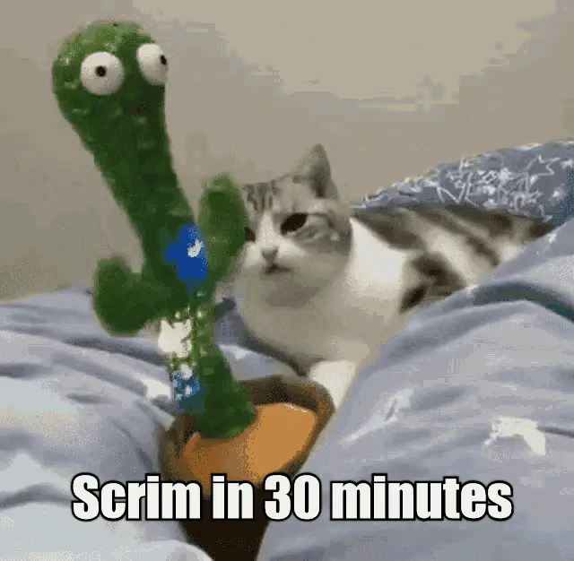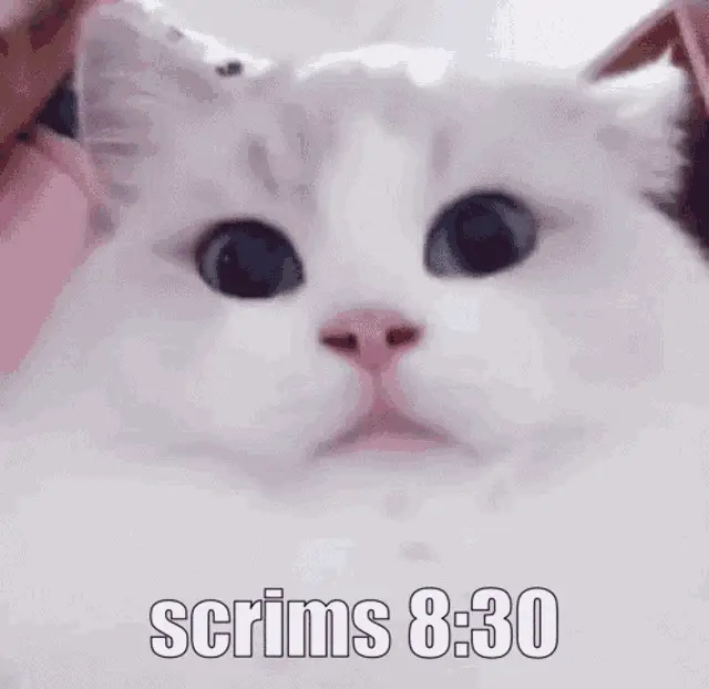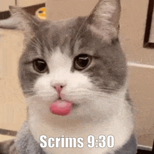 A cute grey and white cat with its tongue slightly out, featuring the text 'Scrims 9:30' below it.