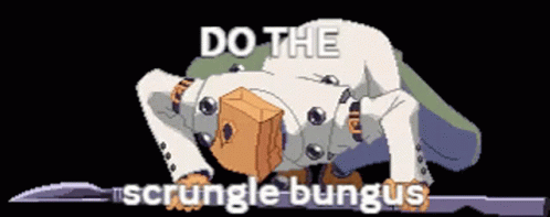 Guilty Gear character Faust, with a box on his head, performs the 'scrungle bungus' dance.