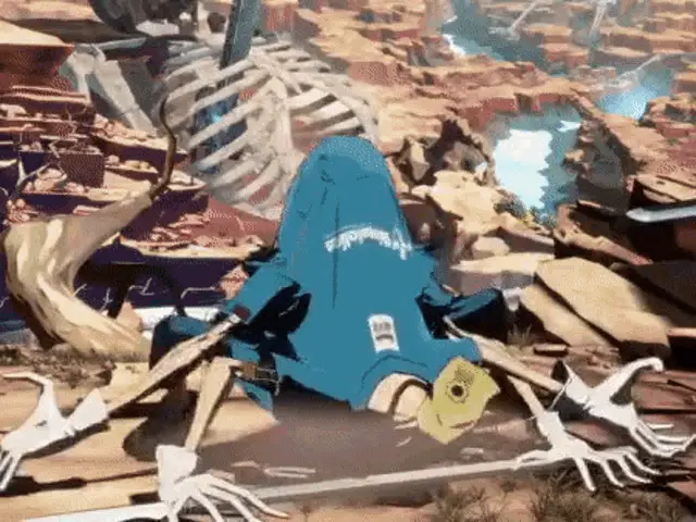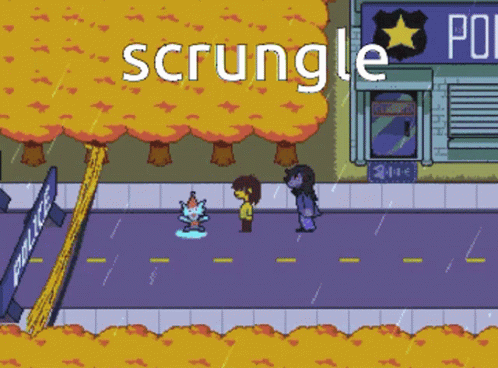 Deltarune characters Kris, Susie, and a small creature dance as the word "scrungle" appears on screen.