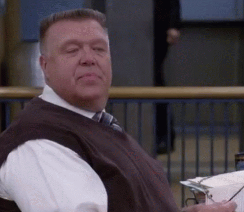 Scully from Brooklyn 99 gives a haughty, unimpressed look while sitting at a table with papers.