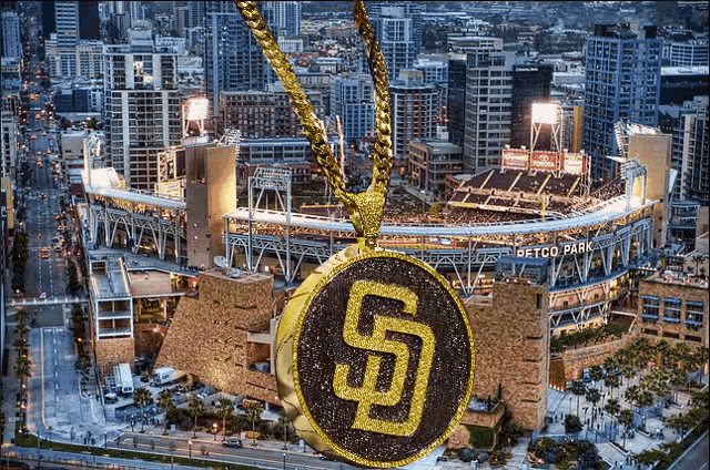 A dazzling San Diego Padres 'SD Swagchain' necklace is showcased against the iconic backdrop of Petco Park and the San Diego skyline.