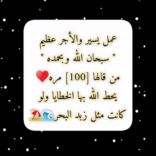 A white square with Arabic text about the great reward of saying 'Subhan Allah wa bihamdihi' 100 times, forgiving sins like sea foam.