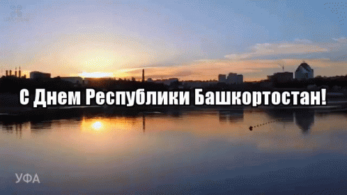 Celebrating Republic Day of Bashkortostan with scenic views of Ufa, featuring a sunset over water and a city bridge.