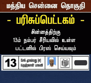 Central Chennai Constituency election guide showing how to vote for Shaik Mohammed (alias) Thehlan Baqavi with the Gift Box symbol.