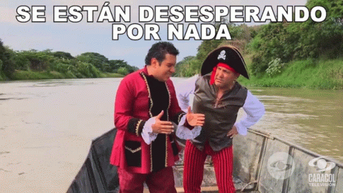 Piroberta and another man in pirate costumes on a boat, despairing for nothing, from Caracol Television.