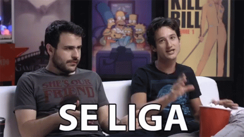 Two men on a couch, one pointing directly at the viewer with the text "SE LIGA" overlaid.
