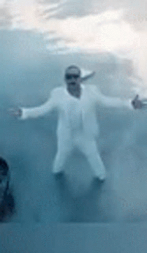 Hector Acosta 'El Torito' in a white suit and sunglasses, standing in misty water with arms outstretched.