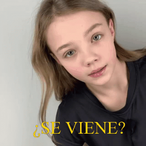A young girl in a black shirt with the words '¿SE VIENE?' in yellow, looking curiously at the camera.