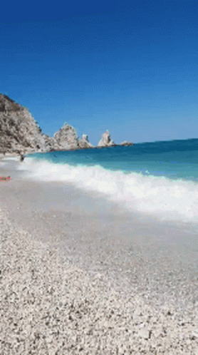 Waves gently crashing on the pebble beach of Sirolo, Italy, with the iconic Due Sorelle rocks in the distance.