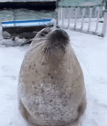 A cute seal sits calmly in the snow, looking up with its whiskers visible, in a wintery setting.